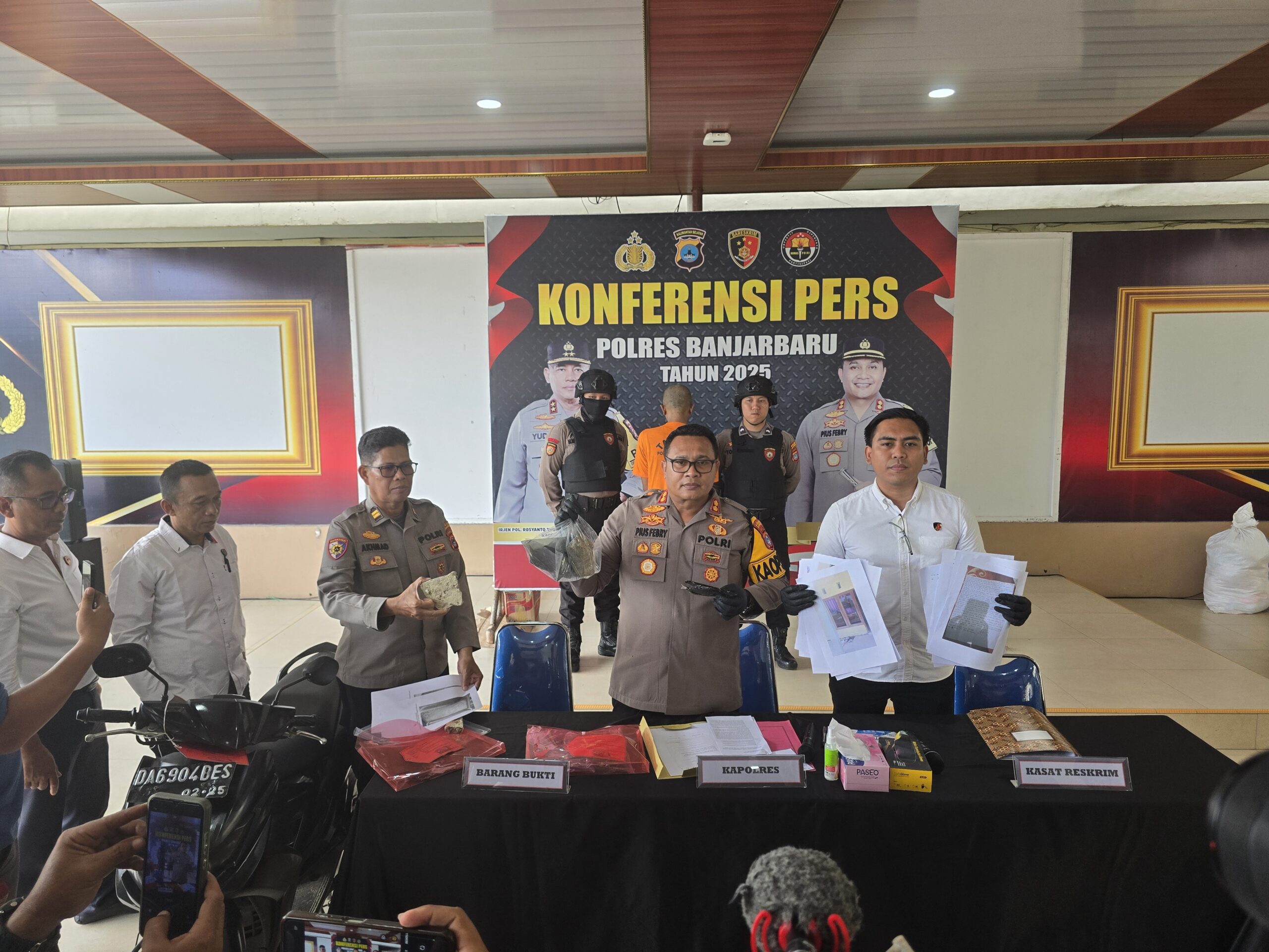Kapolres Banjarbaru AKBP Pius X Febri Aceng Loda dalam konferensi pers pada Senin (17/11/2025) mengungkapkan, penangkapan pelaku AG dilakukan secara cepat pada Sabtu, 15 November 2025, oleh Unit Resmob Satreskrim Polres Banjarbaru. Penyelidikan ini berawal dari masuknya tiga laporan polisi pada 14 November 2025, yang mencakup dugaan tindak pidana penganiayaan berencana, pengrusakan rumah, dan pengancaman.