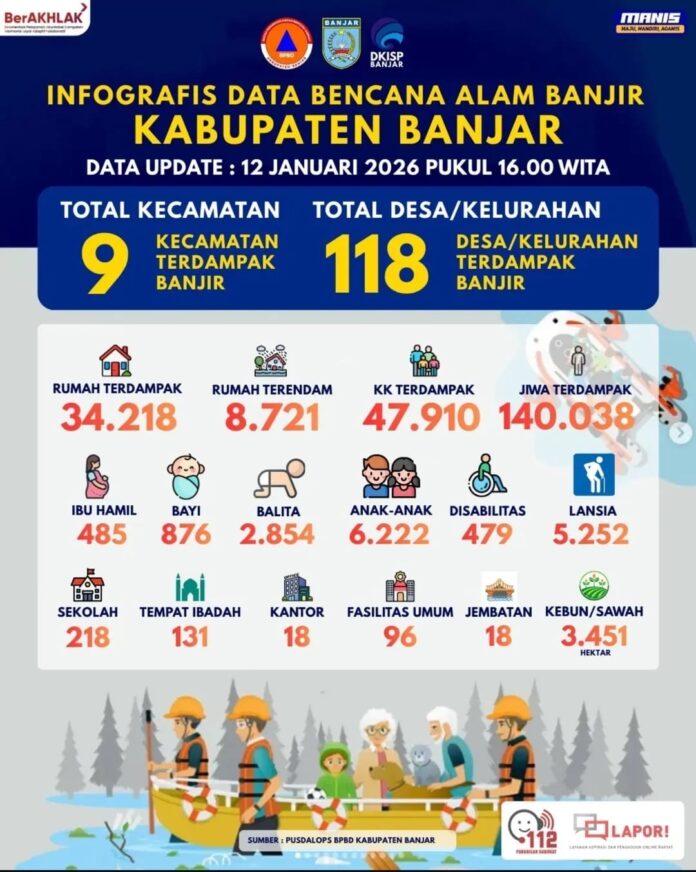 Berdasarkan data Pusat Pengendalian Operasi (Pusdalops) BPBD Kabupaten Banjar per 12 Januari 2026 pukul 16.00 WITA, banjir telah merendam 9 kecamatan yang mencakup 118 desa dan kelurahan.