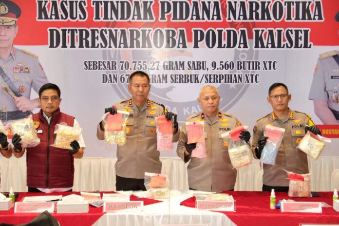 Banjarbaru – Direktorat Resnarkoba Polda Kalimantan Selatan (Kalsel) mengungkap kasus peredaran narkotika jenis sabu-sabu dalam jumlah jumbo pengungkapan jaringan Internasional yang tidak tanggung-tanggung, yakni sebesar 70.755,27 gram atau 70,7 kilogram.