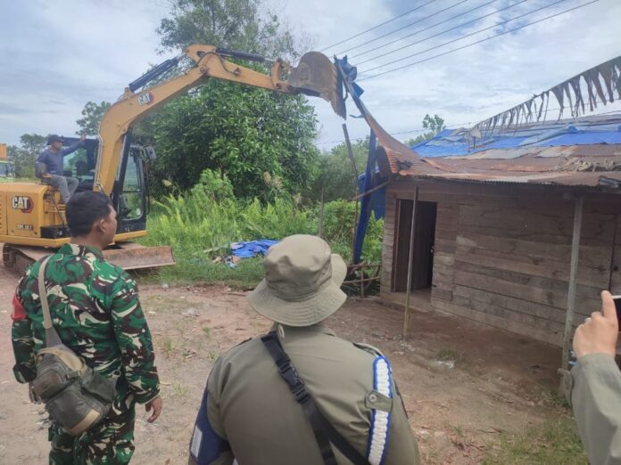 GAMBUT – Puluhan bangunan tak berizin yang berada di Desa Kayu Bawang, Kecamatan Gambut, dibongkar oleh jajaran Satuan Polisi Pamong Praja (Satpol PP) Kabupaten Banjar pada Rabu (15/4/2026) pagi. Tindakan tegas ini diambil lantaran bangunan-bangunan yang sekilas tampak seperti warung makan dan kedai minuman tersebut rupanya menyembunyikan fasilitas terlarang, yakni ruang karaoke hingga bilik kamar.