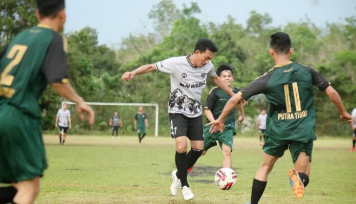 Sorak Sorai dukungan warga Desa Awang Bangkal Timur menjadikan laga persahabatan Putra Timur FC versus Manis FC semakin seru dari awal peluit wasit dibunyikan, di lapangan sepakbola Desa Awang Bangkal Timur, Kecamatan Karang Intan, Rabu (8/2/2023) sore.