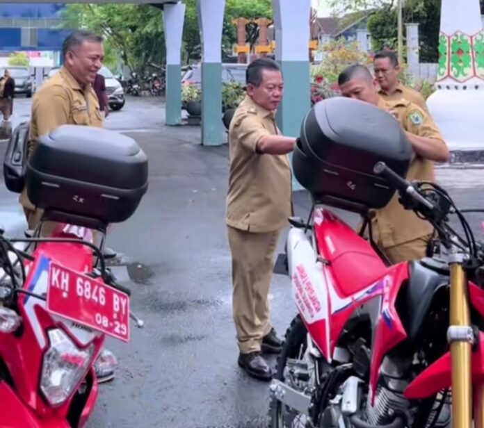 Kuala Kapuas – Bupati Kapuas, Kalimantan Tengah, H Muhammad Wiyatno didampingi Wakil Bupati Kapuas Dodo menyerahkan bantuan kendaraan operasional roda dua jenis trail untuk penanganan Kebakaran hutan dan Lahan (Karhutla) kepada seluruh Camat se Kabupaten Kapuas, Senin (21/4/2025) di depan Halaman Rujab Bupati Kapuas, Jalan Jenderal Sudirman.