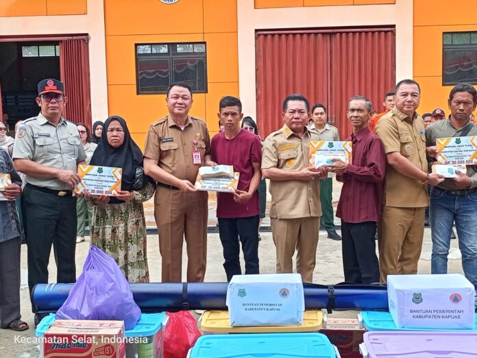 Kapuas Timur, satu unit rumah rusak berat menerima bantuan 30 juta rupiah, satu paket sembako satu paket peralatan dapur, satu matras.