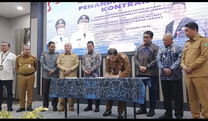 KOTABARU – Bupati Kotabaru H. Muhammad Rusli, S. Sos Hadiri Penandatanganan Proyek Strategis Pembangunan Jembatan Pulau Laut yang memasuki tahap lanjutan kontrak kerjasama antara Pemerintah Provinsi Kalimantan Selatan dan Pemerintah Kabupaten Kotabaru serta Pemerintah Kabupaten Tanah Bumbu, yang berlangsung di Aula Kantor Dinas Pekerjaan Umum dan Penataan Ruang Provinsi Kalimantan Selatan, Banjarbaru. Senin (30/3/2026).