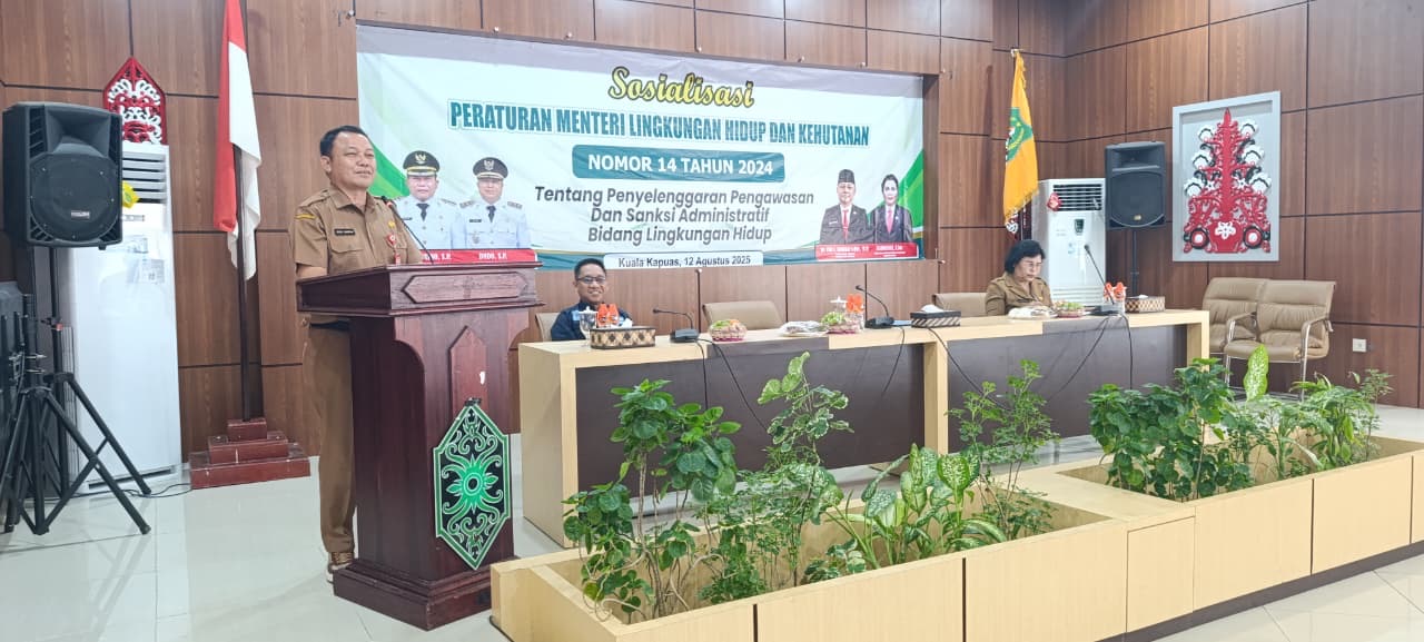 Kuala Kapuas- Dinas Lingkungan Hidup dan Kehutanan Kabupaten Kapuas sosialisasi Peraturan Menteri nomor 14 tahun 2024, tentang penyelenggaraan pengawasan dan sanksi administratif bidang lingkungan hidup, di Aula Kantor Baperida, Selasa (12/8/2025).