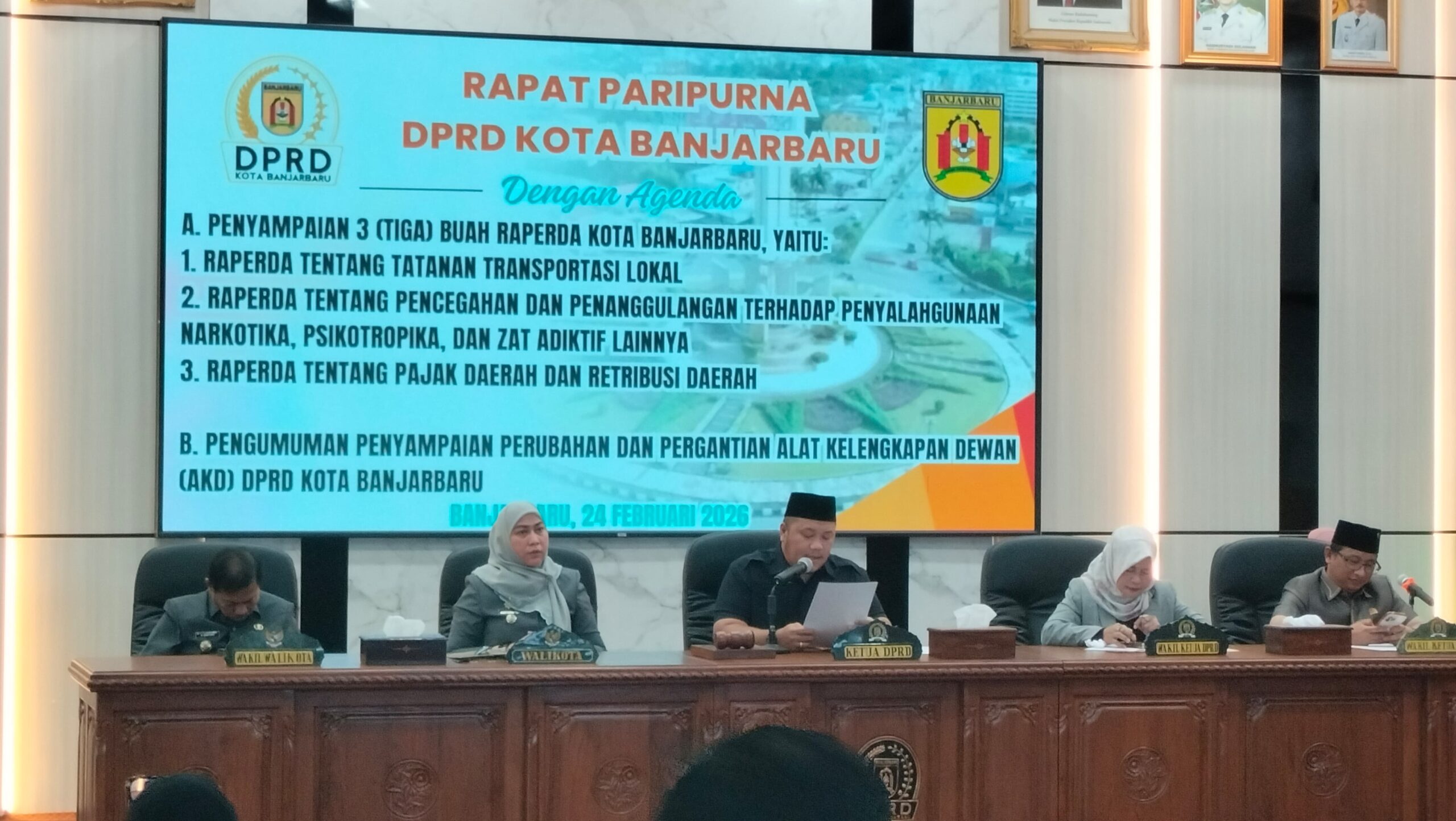 Banjarbaru — Dewan Perwakilan Rakyat Daerah (DPRD) Kota Banjarbaru menggelar Rapat Paripurna dengan agenda penyampaian tiga Rancangan Peraturan Daerah (Raperda) inisiatif Pemerintah Kota Banjarbaru, Selasa (24/02/2026), di Ruang Graha Paripurna DPRD Kota Banjarbaru.