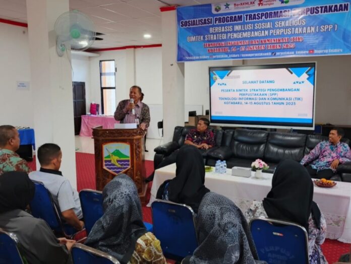 KOTABARU – Dinas Perpustakaan dan Kearsipan (Dispersip) Kabupaten Kotabaru menggelar Sosialisasi Program Transformasi Perpustakaan Berbasis Inklusi Sosial sekaligus Bimbingan Teknis (Bimtek) Strategi Pengembangan Perpustakaan, bertempat di Aula Dispersip Kotabaru Kamis (14/8/2025).