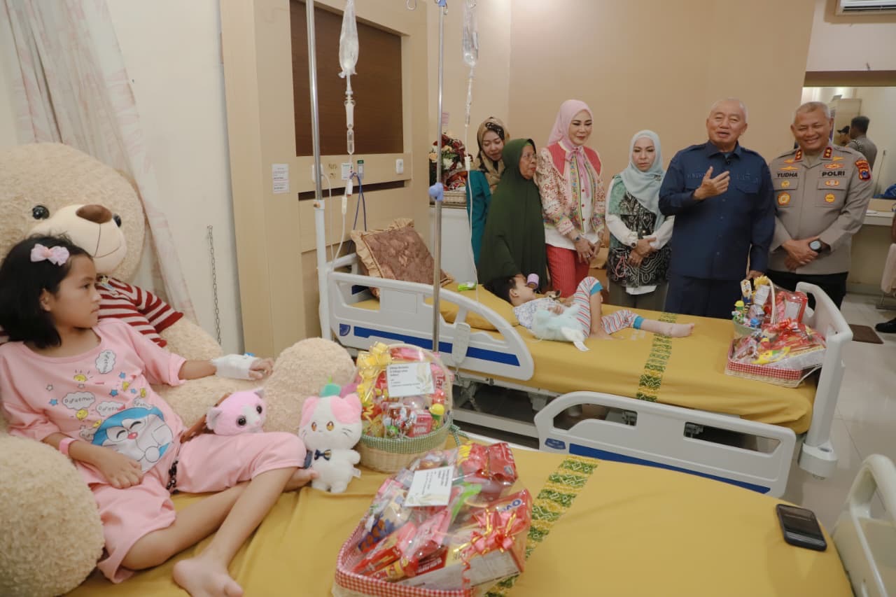 Banjarmasin — Penuh kehangatan dan kepedulian, Gubernur Kalimantan Selatan H. Muhidin bersama istri Hj. Fathul Jannah, didampingi Kapolda Kalsel Irjen Pol Rosyanto Yudha beserta istri Hj. Yeni Susanty, mengunjungi dua anak yatim piatu yang tengah menjalani perawatan di RS Bhayangkara Banjarmasin, Kamis (22/1/2026) pagi.