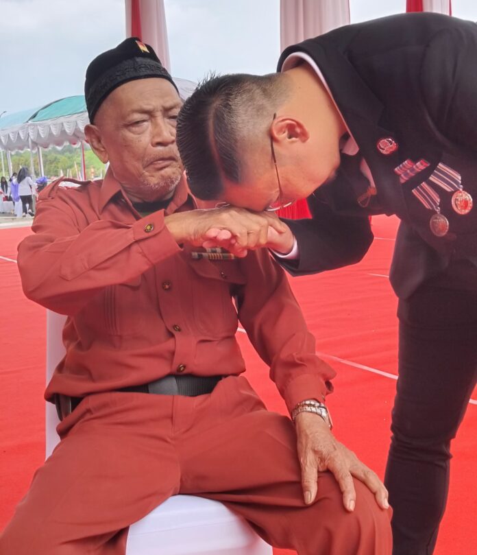 Dalam momen penuh kehangatan itu, Gusti Abdul Wakhid tampak mencium tangan Idris.A salah seorang Veteran yang mengikuti HUT RI ke- 80 di Sebelimbingan ini mencerminkan rasa hormat mendalam terhadap para veteran di Kotabaru.