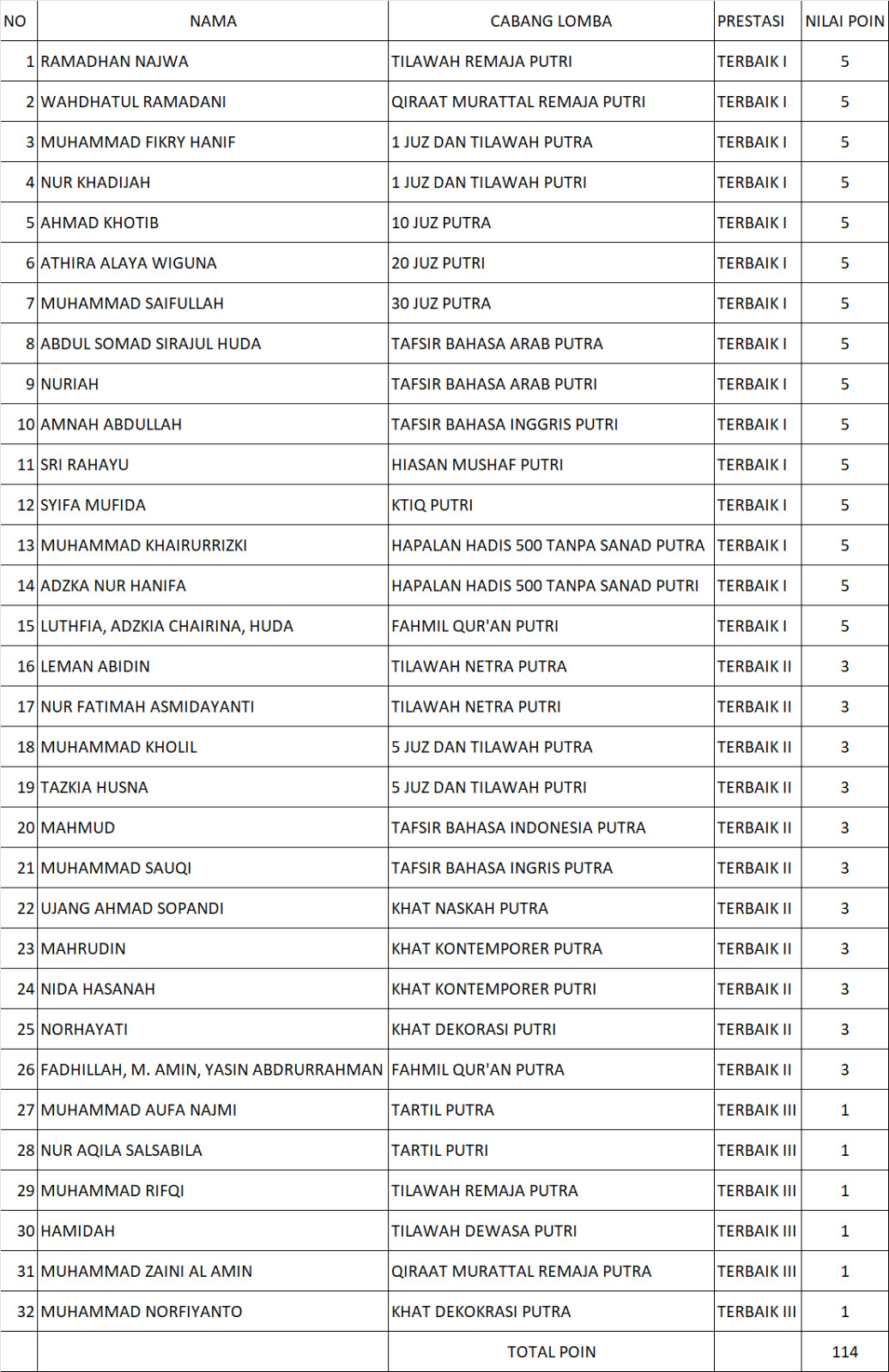 Berikut rincian cabang lomba dari keseluruhan total nilai 114 poin tersebut.