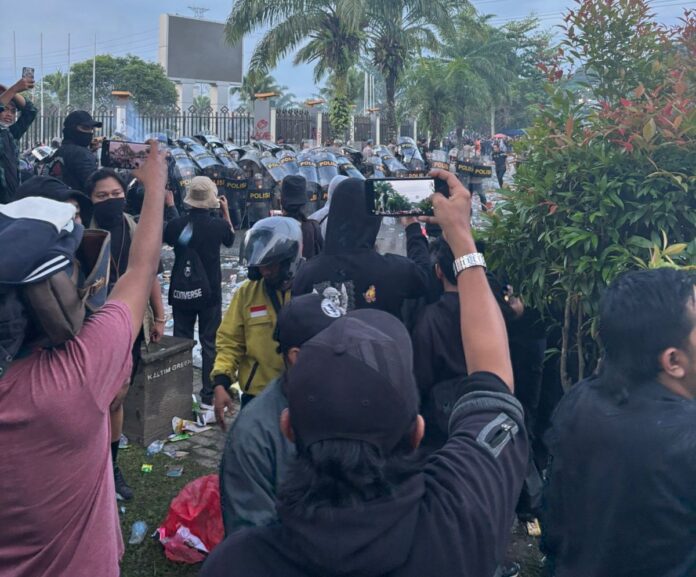 Bahkan pagar depan dipenuhi coretan cat semprot, Gerbang besi penyok, tanaman hias tercerabut, hingga plang bertuliskan “DPRD Provinsi Kaltim” masih kotor plus coretan bernada kritik masih melekat. Hal itu tentu jadi penanda eskalasi aksi yang sempat memanas.