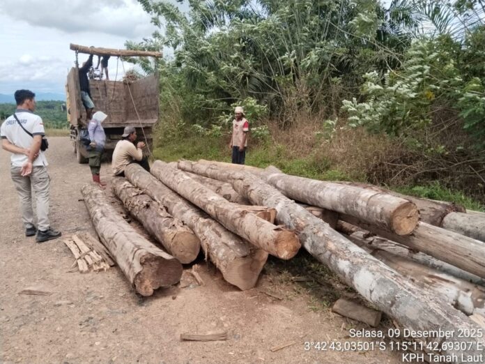 Pelaihari – Kesatuan Pengelolaan Hutan (KPH) Tanah Laut mengamankan puluhan batang kayu yang diduga berasal dari aktivitas penebangan ilegal saat melaksanakan patroli pengamanan kawasan hutan di Desa Riam Adungan, Kecamatan Kintap, Kabupaten Tanah Laut, Jumat (12/12/2025).