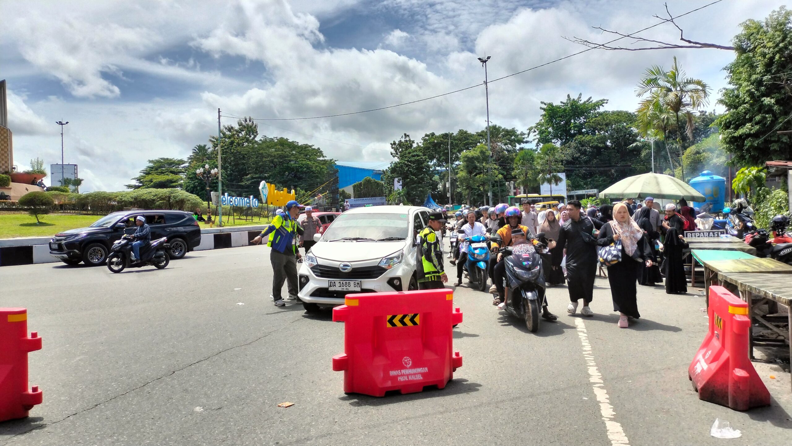 Pantauan di lapangan menunjukkan arus masuk kendaraan roda empat dari Jalan A. Yani, khususnya dari Bundaran Simpang Empat Banjarbaru menuju arah Sekumpul, telah dialihkan ke kantong parkir Demang Lehman melalui Jalan PM Noor.