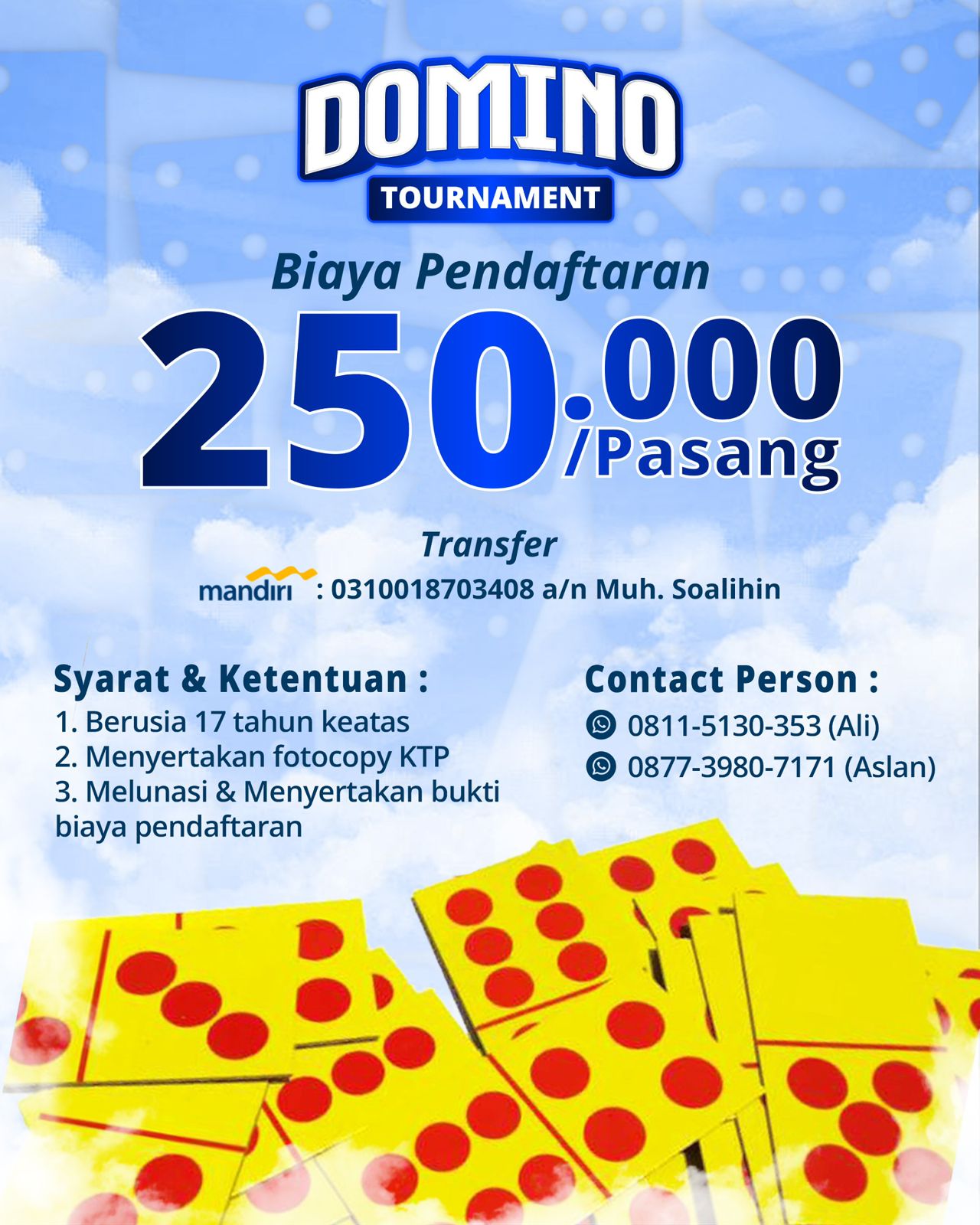 Turnamen domino tersebut di buka untuk umum, dengan biaya pendaftaran 250.000/ pasang.