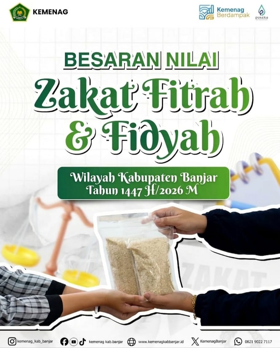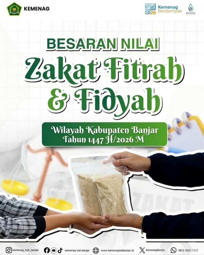 ​“Besaran zakat fitrah di Kabupaten Banjar tahun 1447 H/2026 M ini ditetapkan 2,7 kilogram atau 3,5 liter beras per jiwa, dan dapat dibayarkan dalam bentuk uang yang disesuaikan dengan harga beras yang dikonsumsi sehari-hari,” tulis H. Muhammad Rofii dalam surat yang ditandatangani pada 24 Februari 2026 tersebut.