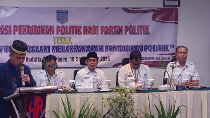 BANJARBARU – Pemerintah Kabupaten Banjar melalui Badan Kesatuan Bangsa dan Politik (Kesbangpol) menyelenggarakan sosialisasi pendidikan politik di Hotel Roditha Banjarbaru, Rabu (10/9/2025). Peserta kegiatan terdiri atas pengurus partai politik (parpol) serta perwakilan masyarakat dari berbagai unsur.
