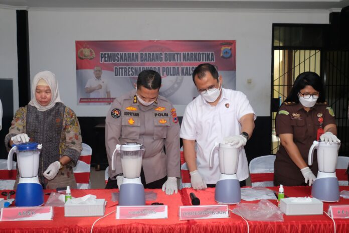 Banjarmasin – Direktorat Reserse Narkoba (Ditresnarkoba) Polda Kalimantan Selatan (Kalsel) memusnahkan barang bukti narkoba jenis sabu-sabu seberat 2.568,72 gram. Pemusnahan yang dilakukan dengan cara dihancurkan menggunakan blender, berlangsung pada Kamis (28/8/2025) di Gedung Direktorat Perawatan Tahanan dan Barang Bukti (Dit Tahti) Polda Kalsel, Banjarmasin.