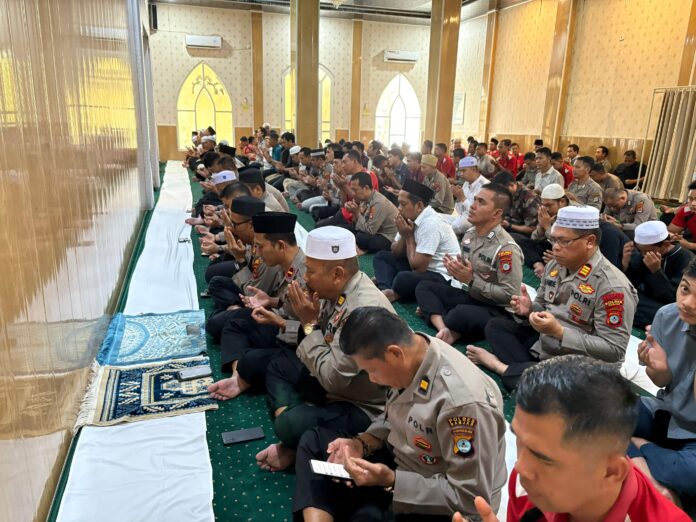 Martapura – Polres Banjar Polda Kalsel menggelar sholat ghaib dan doa bersama pada Jumat (29/8/2025) di Mushola An-Nur Polres Banjar. Kegiatan ini dilaksanakan sebagai bentuk kepedulian dan dukungan spiritual demi keselamatan bangsa, serta kelancaran tugas negara yang tengah dijalankan oleh jajaran Polda Metro Jaya dan Korps Brimob Polri.
