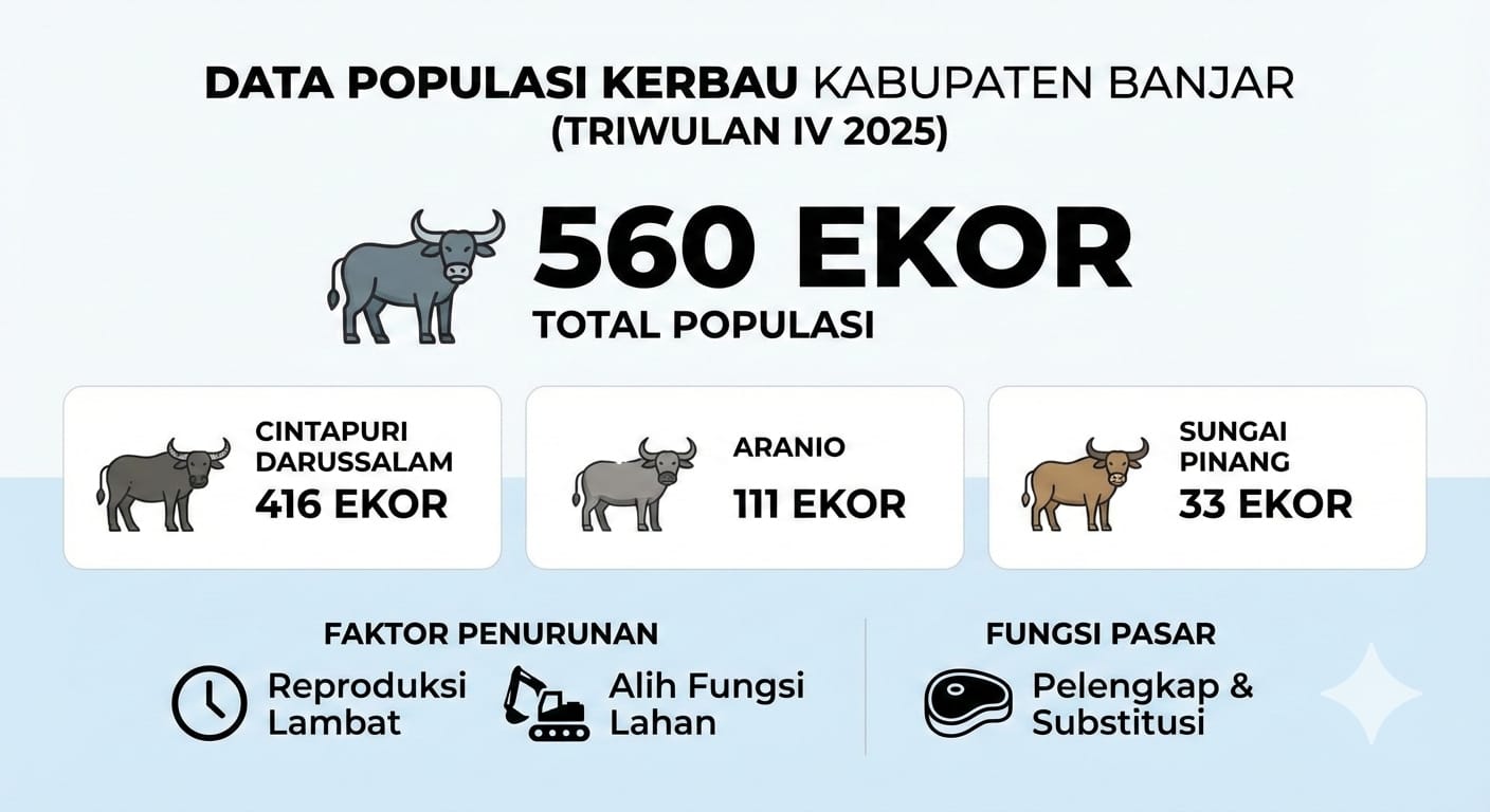 Kondisi populasi yang minim ini turut dibuktikan oleh data resmi Triwulan IV Tahun 2025. Menurut Kepala Seksi Kesehatan Masyarakat Veteriner, drh. Asep Yusup Nugraha Siliwandi, total keseluruhan kerbau yang tersisa di Kabupaten Banjar kini hanya menyentuh angka 560 ekor.