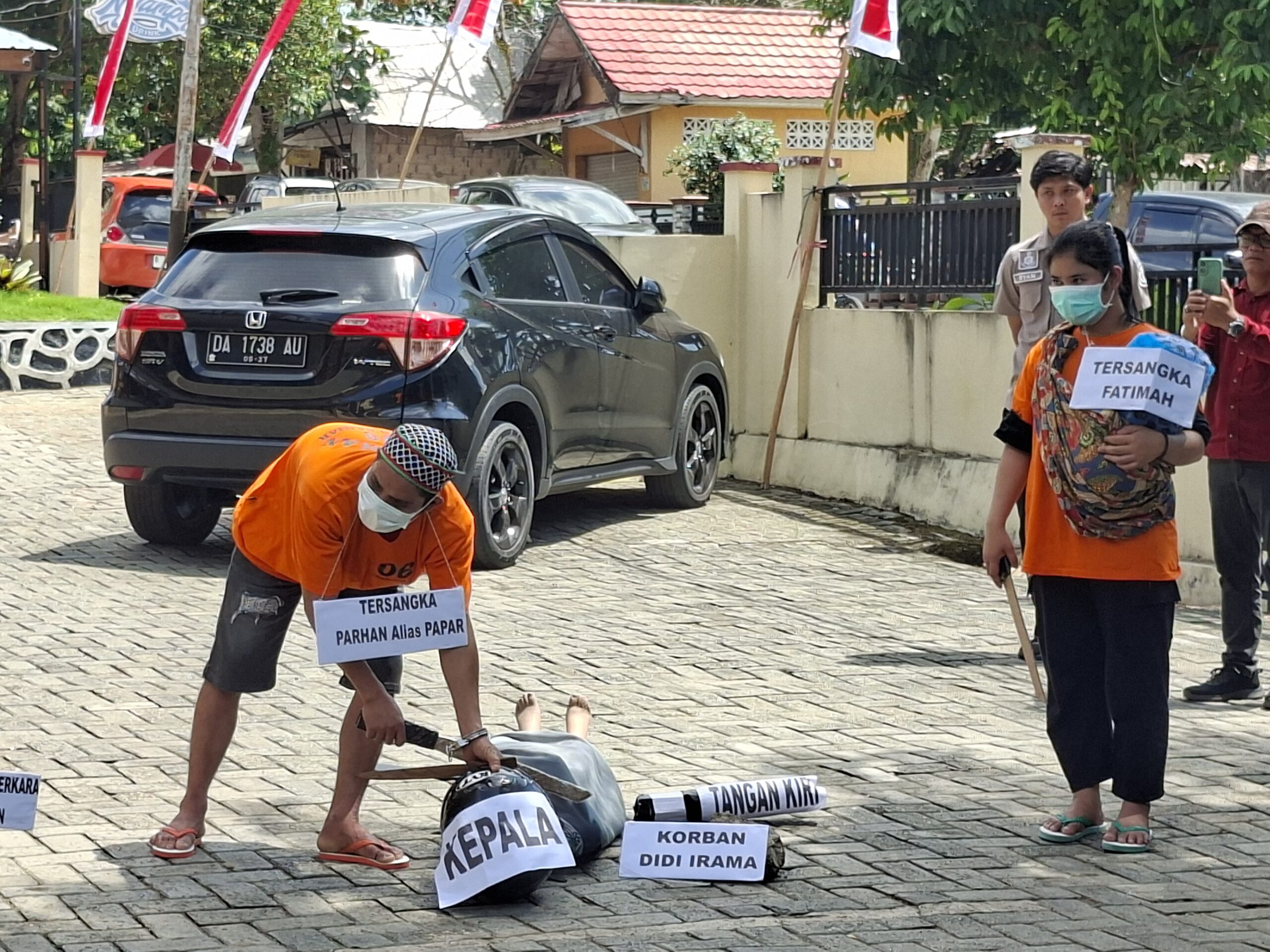 Dua tersangka yang merupakan kakak beradik, FT (28) dan PP (34), menjalani rekonstruksi 43 adegan pembuhunan mutilasi terhadap korban berinisial DI, yang tak lain adalah suami FT dan adik ipar dari PP.