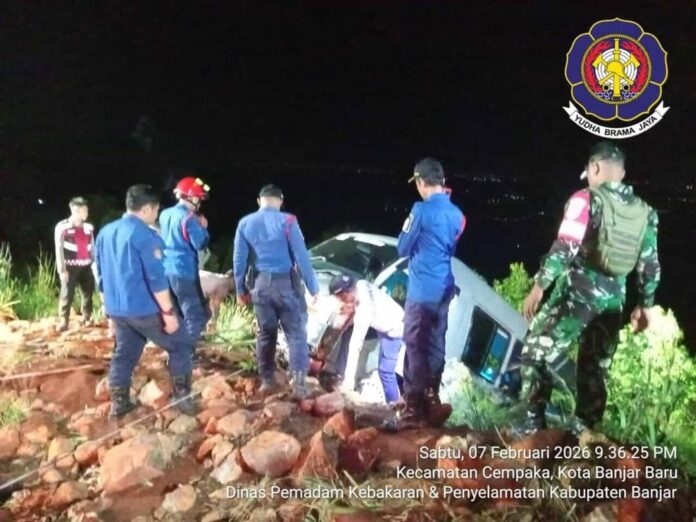 MARTAPURA — Niat hati menikmati akhir pekan, rombongan wisatawan asal Barabai, Kabupaten Hulu Sungai Tengah (HST), justru mengalami nasib naas pada Sabtu (7/2/2026) malam. Minibus Elf dengan nomor polisi DA 7647 HB yang mereka tumpangi tergelincir dan jatuh ke jurang di kawasan wisata Taman Hutan Raya (Tahura) Sultan Adam, Mandiangin, Kecamatan Karang Intan, Kabupaten Banjar.