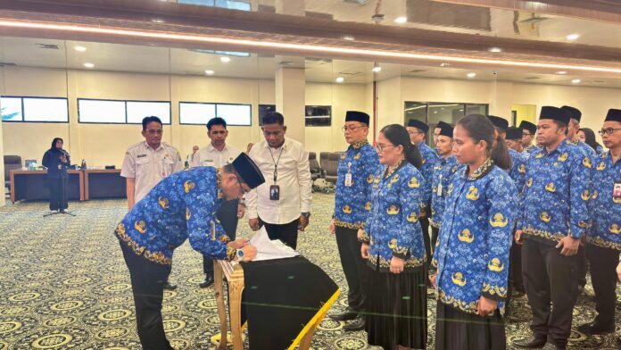 KOTABARU – Pemerintah Kabupaten Kotabaru melalui Sekretaris Daerah (Sekda) H. Eka Saprudin, AP., M.AP., melantik dan mengambil sumpah janji jabatan pejabat fungsional sebanyak 180 orang di lingkungan Pemerintah Kabupaten Kotabaru. Kegiatan tersebut berlangsung khidmat di Aula Bamega Kantor Bupati Kotabaru, Rabu (5/11/2025).