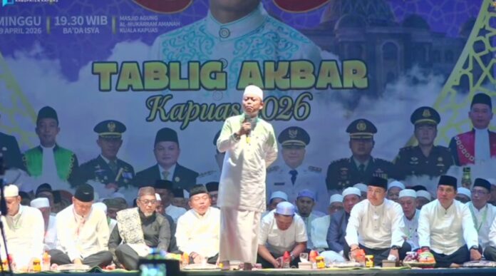 Kuala Kapuas – Ribuan jamaah memadati halaman Masjid Agung Al Mukarram Amanah dalam kegiatan Tablig Akbar Kapuas 2026, Minggu (19/4/2026) malam. Kegiatan ini digelar Pemerintah Kabupaten Kapuas dalam rangka memperingati Hari Jadi ke-75 Pemkab Kapuas dan Hari Jadi ke-220 Kota Kuala Kapuas.