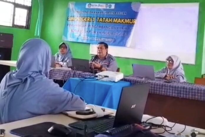 TATAH MAKMUR – Segenap guru beserta tenaga kependidikan di SMPN 1 Tatah Makmur mengikuti program Pengimbasan Pengembangan Karir Pendidik dan Tenaga Kependidikan (PTK) yang berfokus pada Sasaran Kinerja Pegawai (SKP) dan Kinerja Digital.