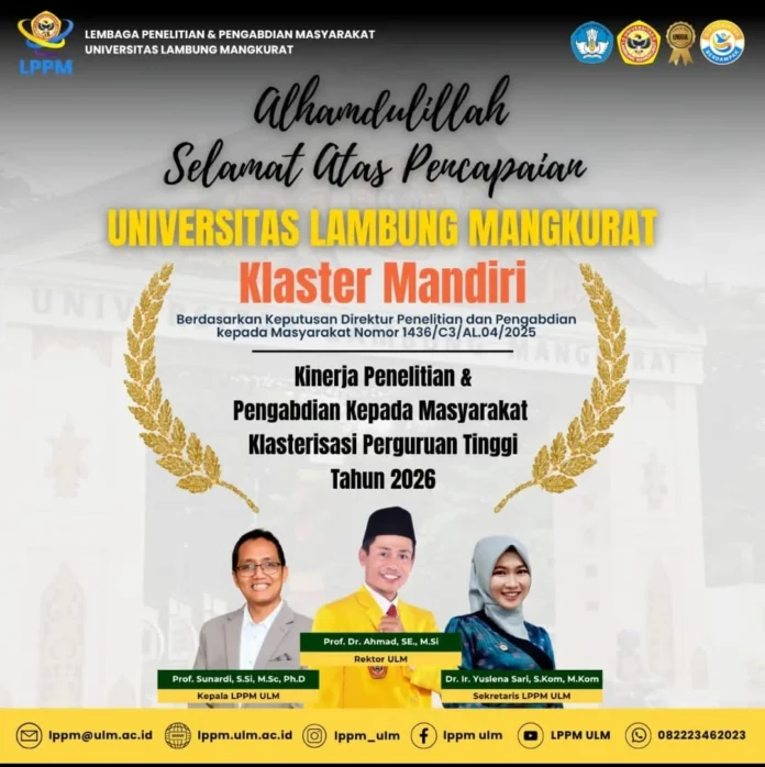 Banjarmasin – Universitas Lambung Mangkurat (ULM) kembali mencatatkan prestasi membanggakan di tingkat nasional. Berdasarkan Keputusan Direktur Penelitian dan Pengabdian kepada Masyarakat Nomor 0968/C3/DT.05.00/2025 tertanggal 28 Oktober 2025, ULM resmi ditetapkan masuk dalam Klaster Mandiri untuk Kinerja Penelitian dan Pengabdian kepada Masyarakat (P2M) Tahun 2026.