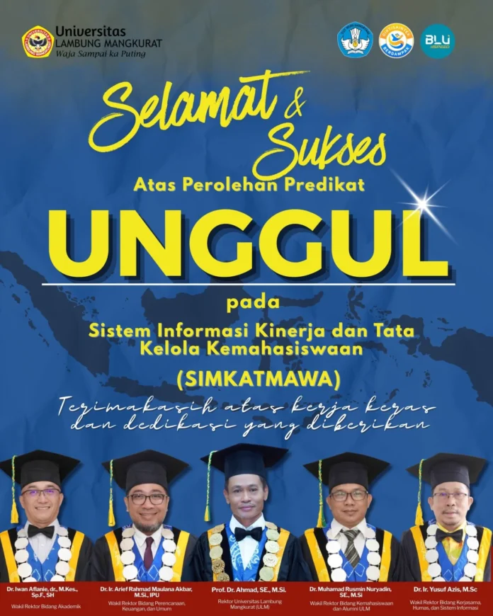 Banjarmasin – Universitas Lambung Mangkurat (ULM) kembali mencatatkan capaian strategis dengan meraih Predikat Unggul pada penilaian SIMKATMAWA 2025. Dengan status sebagai perguruan tinggi Klaster I, ULM masuk dalam kelompok kampus dengan jumlah mahasiswa lebih dari 7.000 dan total nilai akumulasi lebih dari 1.000. Capaian ini menegaskan konsistensi ULM dalam menghadirkan tata kelola kemahasiswaan yang unggul, akuntabel, dan berdampak nyata bagi mahasiswa.